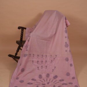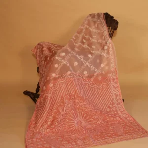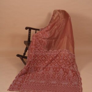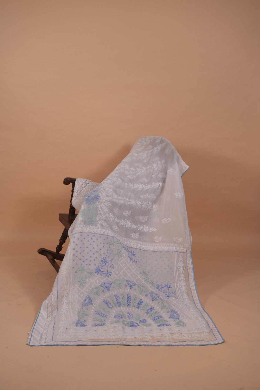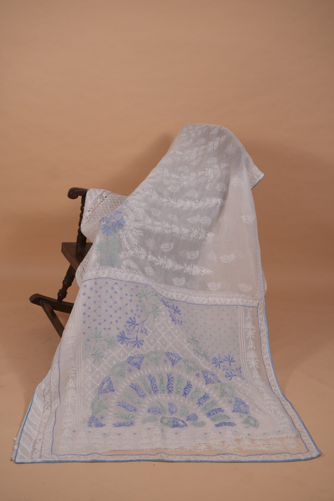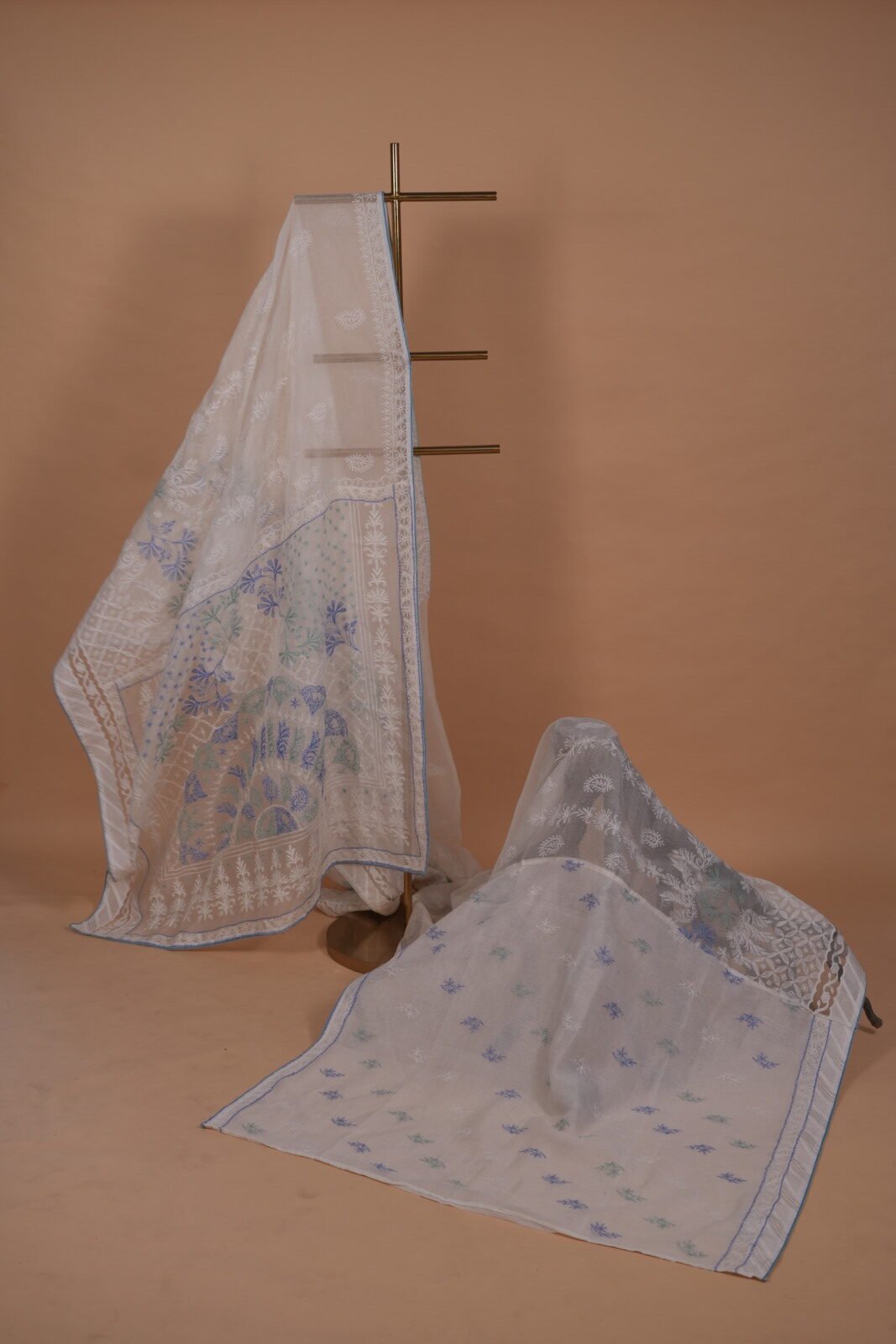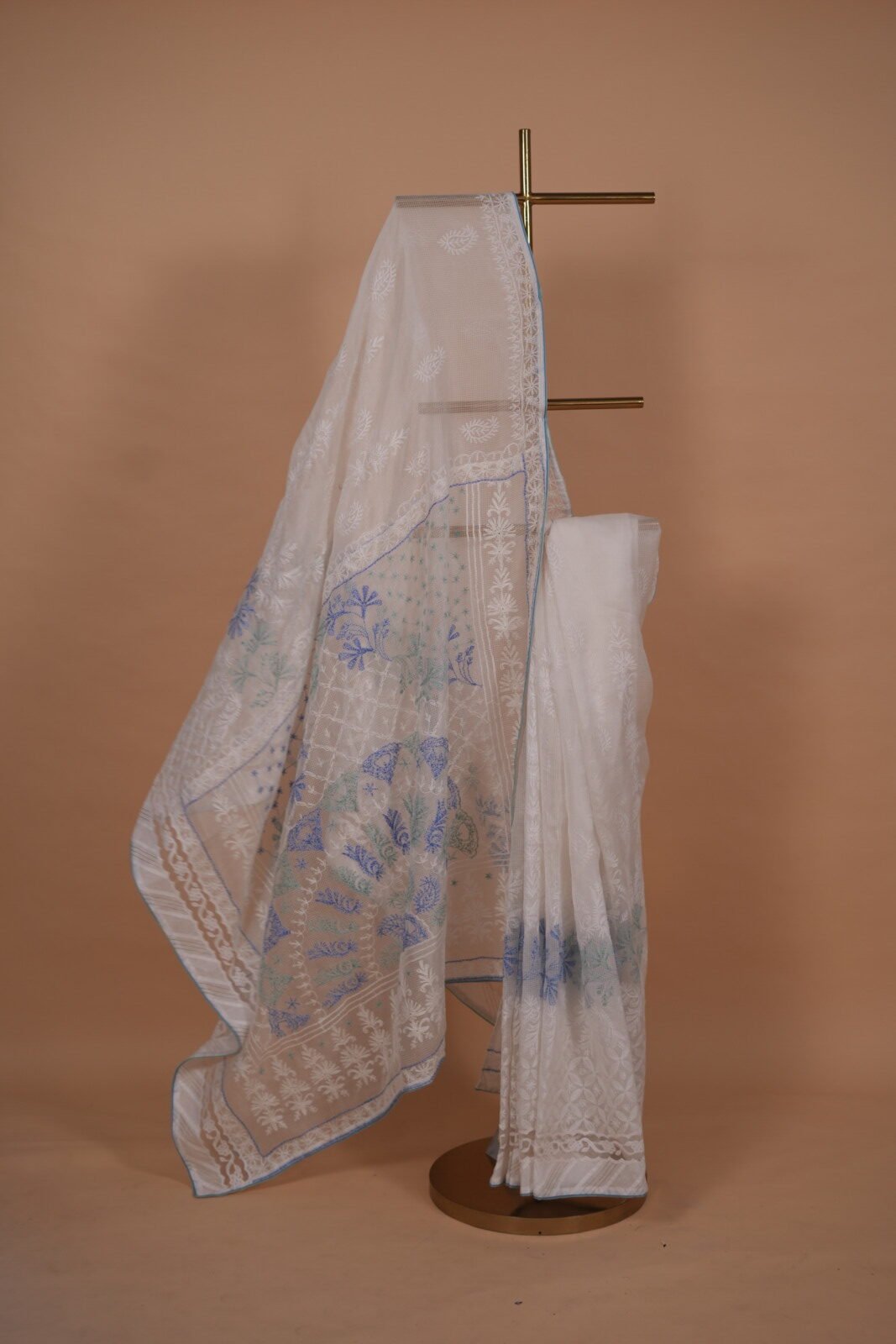 It is a white colored check organza saree with blue green and white color contrasting tapechi embroidery. It is finished with a cutwork and pintucks border. The saree comes with a 1 metre blouse and lining.