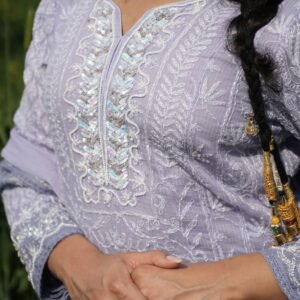 Elegant white chikankari suit set with purple shading featuring intricate embroidery and beadwork for unique ethnic style.