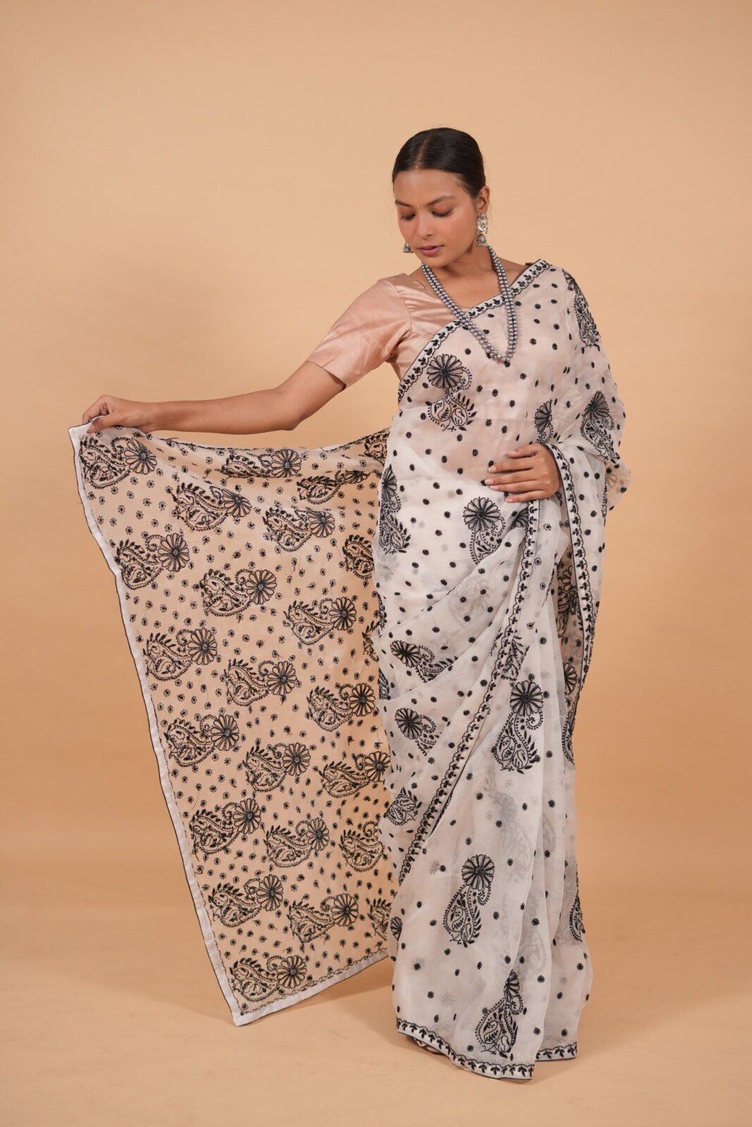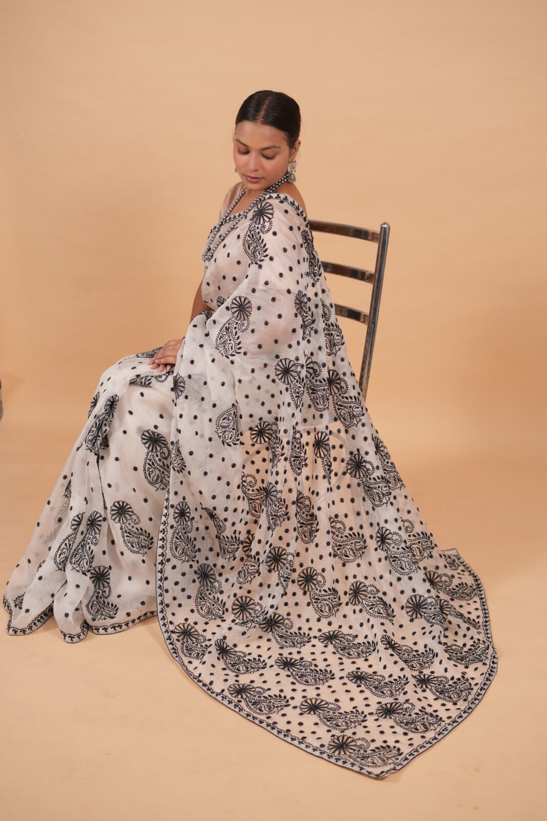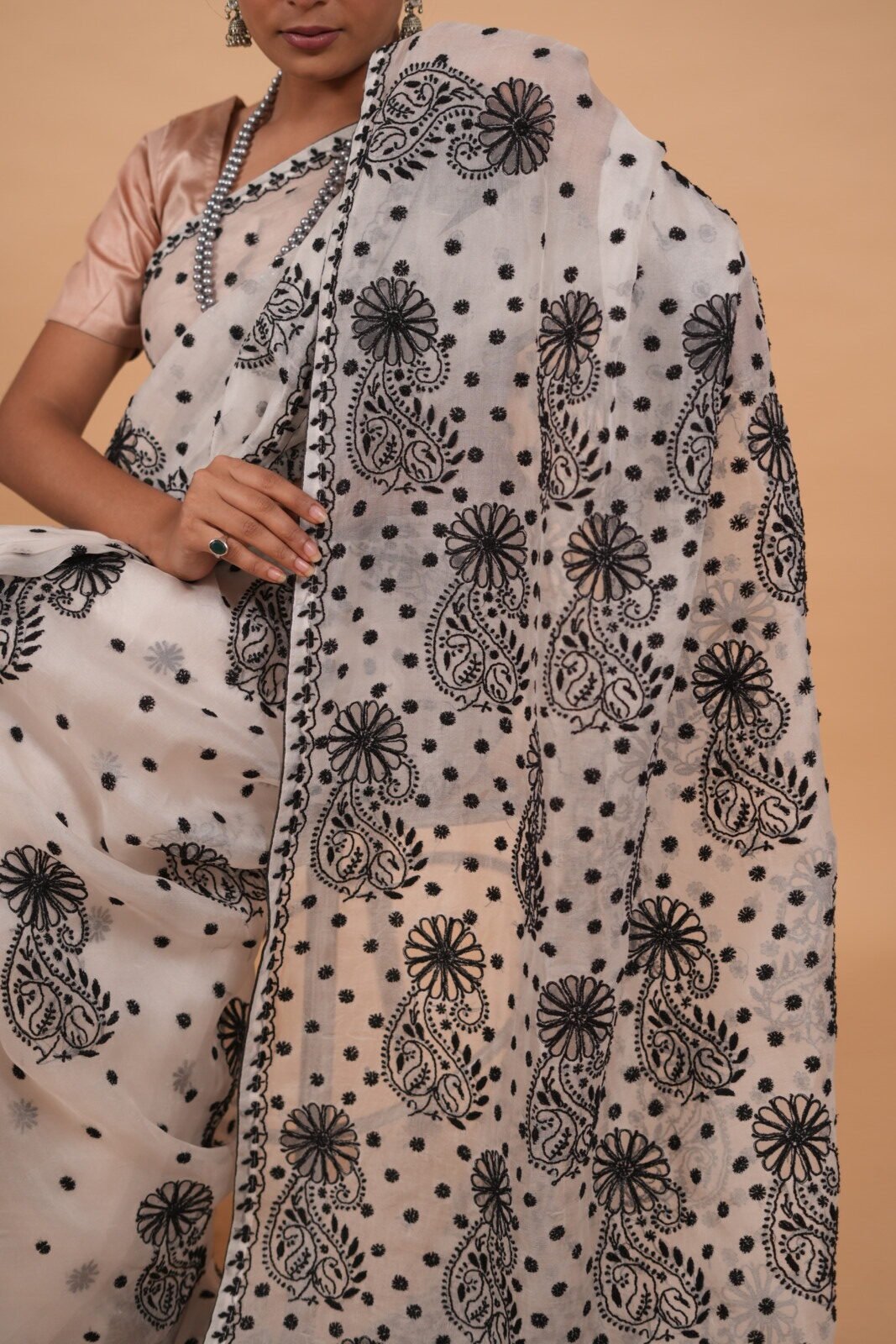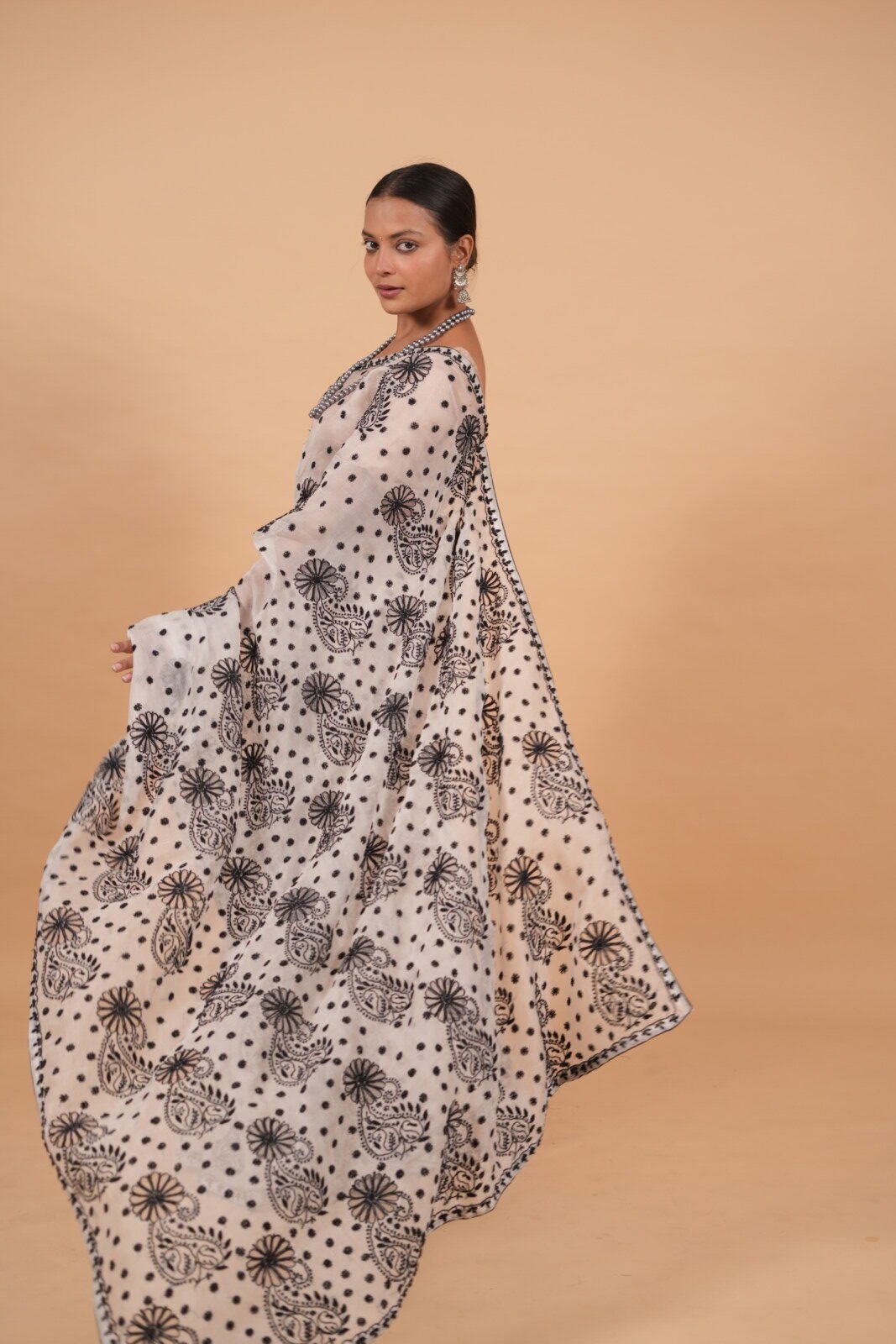 White silk organza saree with black cutwork