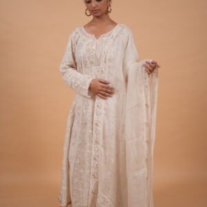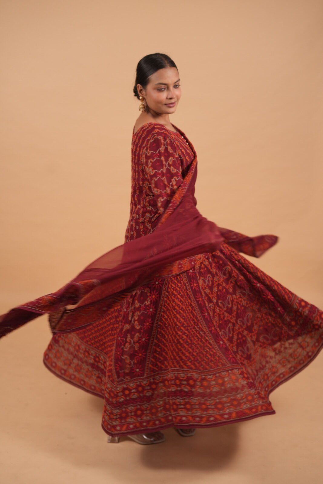 A set 4 pc wine colored georgette Anarkali embroidered with contrasting embroidery work in the shades of rust & cream . All over embroidered with ghaspatti. The look is completed with a chiffon dupatta.