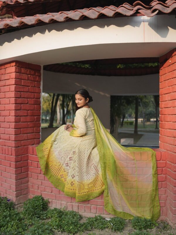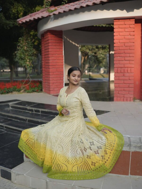 Lime yellow with shading of home green Anarkali set in cotton Voil
